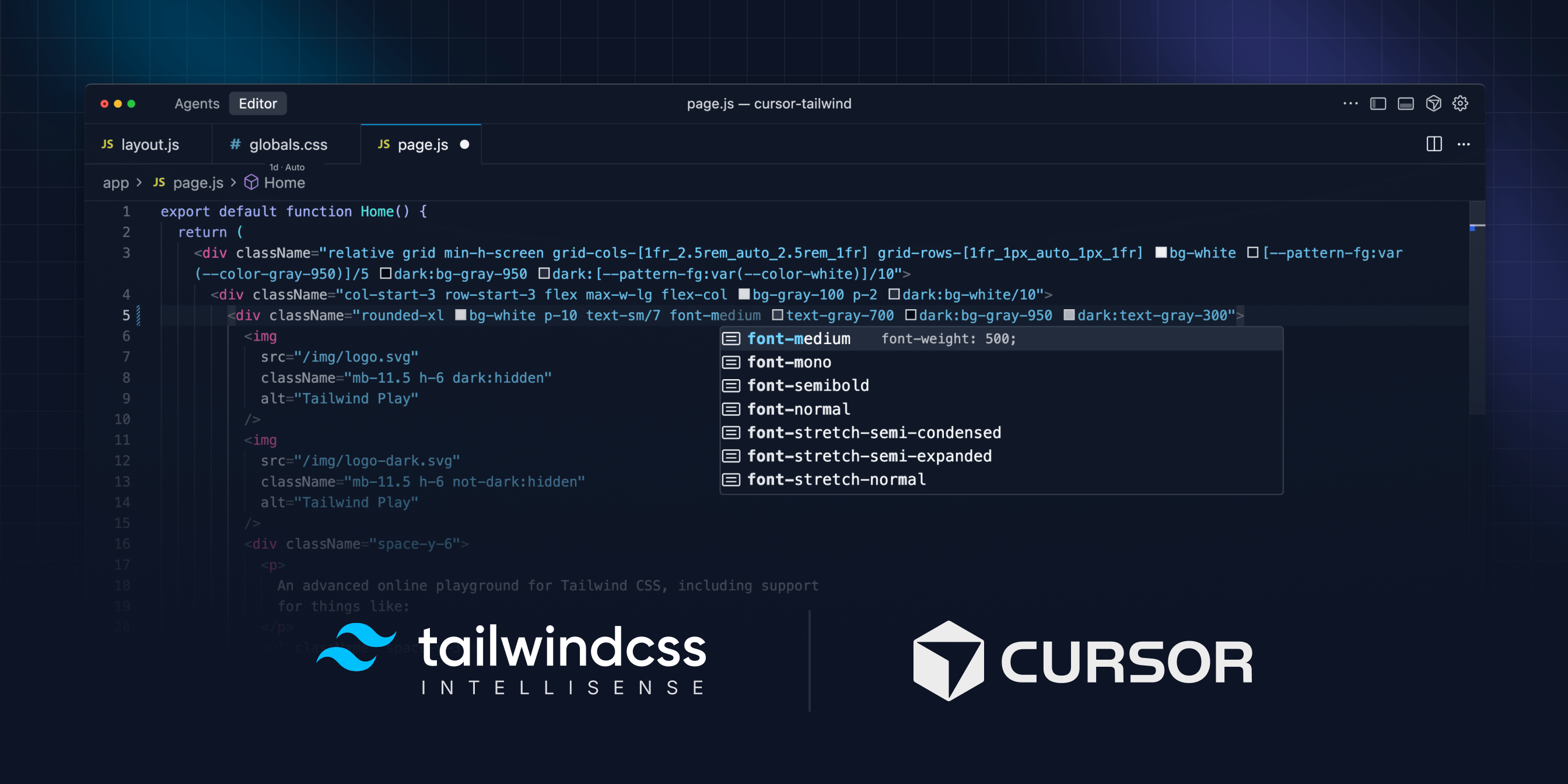 Cursor 是一款原生 AI 代码编辑器,具有上下文感知的自动补齐功能和内置的编码助手。由于它支持 VS Code 扩展,你已经熟悉的所有 Tailwind CSS 工具都可以开箱即用——包括我们官方的 Tailwind CSS IntelliSense 扩展以及用于类排序的 Prettier 插件。